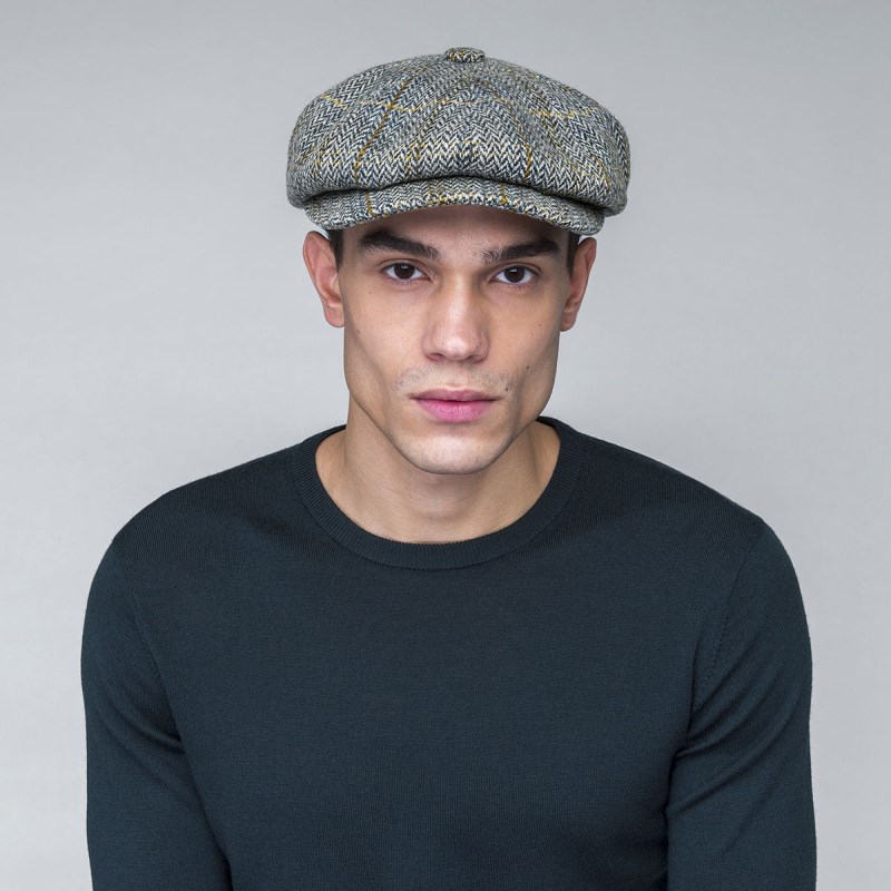 Foster is an 8/4 Cap in a wool blend with convertible earflaps for cold and windy days. It's herringbone pattern with contrast Stripe details really stand out. Fully lined, it feels soft on the head and fits great. Shape: Newsboy Fabrication: Wool BlendMaterial: 80% Wool/20% PolyesterLining: LinedClosure Type: FittedUSA Made or Imported: Imported
